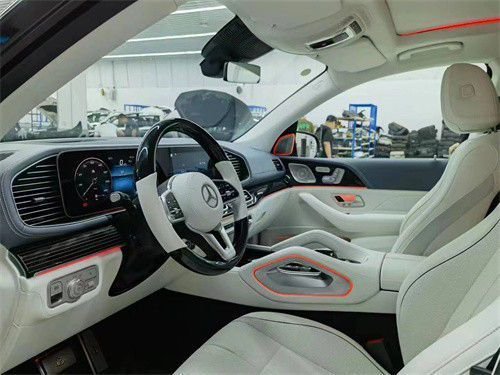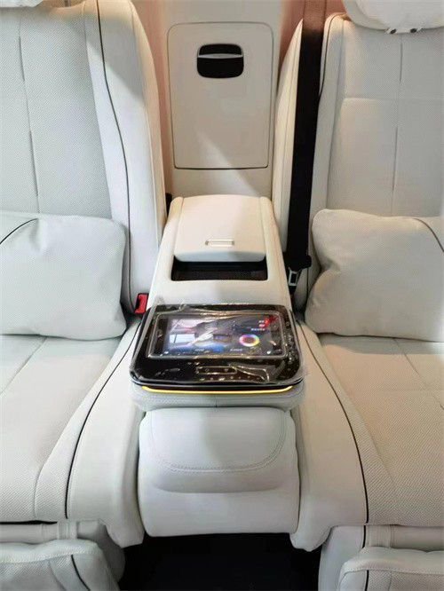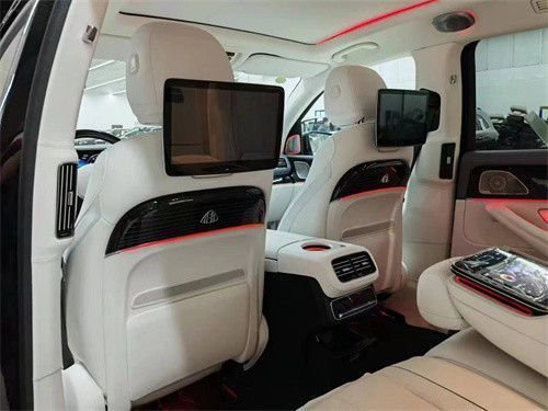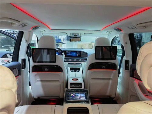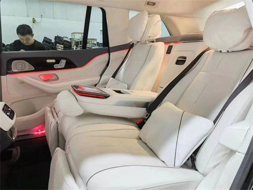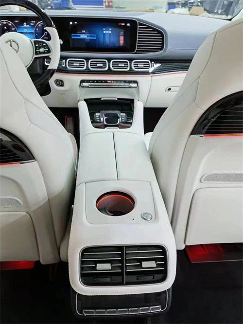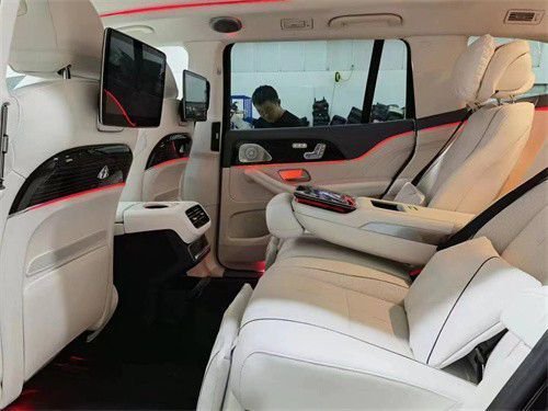 原车标配7座或单选6座布局,升级改装为迈巴赫GLS600。整体布局变为4座板,取消了第3排,后排升级为两张独立航空座椅,支持前后靠背角度,腰部调节通风,加热按摩,腿托调节,打造出头等舱级的舒适驾乘体验,后面的冰箱采用了和迈巴赫同样品质,冷热杯架,无线充电,平板电脑,小桌板等等也是应有尽有,除此之外,全景天窗上的遮阳帘我们也直接替换成了原厂件,迈巴赫同款的氛围灯也将全部升级到这款奔驰GLS450上面。