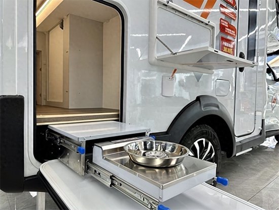 厨房区为超大空间的料理台设计,内部配有水龙头、洗菜池、电磁炉、微波炉以及抽烟烟机等,配置非常齐全,油烟机和外推窗的设计,可以保证厨房内部空气清新干净。厨房内还配有冰箱,容量为85L,可以选装152L,可以自由的调节温度,满足不同种类食材的储存需求,在操作台下方和顶部均配有储物柜,存放厨具和调味品非常的方便。
