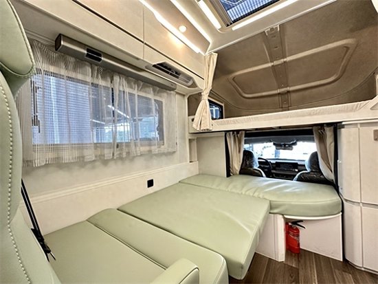 会客区采用对卡座的设计,由于这款车是四座版车型,在行车过程中只有两个正向座椅可以乘坐,对向的座椅则是在驻车时才能使用。按住餐桌边缘的开关就可以降低餐桌与卡座拼成床用于休息。尺寸达到了1.7m*0.9m。大空间的实用感受,也是完全符合其产品定位,更亲近家庭的旗舰布局,6人旅居皮卡房车。