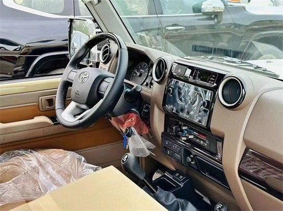 23款丰田酷路泽LC76整体布局与老款车型设计风格相似,中控台按键不多,操作简单,同时为方便驾驶者员操作,均被安排在中控台左侧,光秃秃的四幅方向盘,与传统的手柄式手刹,这一切只为简单可靠,光秃秃的方向盘,没有豪华SUV那么多按键,没有定速巡航,一切只为简单可靠。