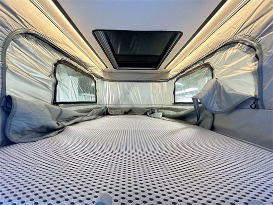 整车是升顶房车,就是顶部可以升高,用的是RTM高强度前顶,,复合三层高强度升顶底座,一体成型的升顶车顶,带保温防水的功能。而且顶部升起来之后,整个车内部的空间高度有所增加,顶部也可以跟随自己的需要升高或者降低。升顶大床尺寸为2200*1180mm,满足一个成年人休息,尺寸完全够用。