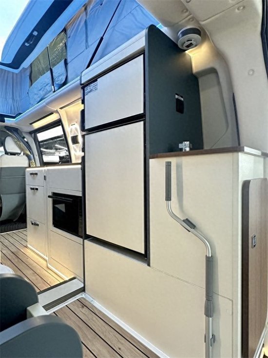 上门紧挨着就是厨房区域,大抽屉,延伸板,电磁炉,洗水槽等全部配备,车内也能偶尔做个简单的餐食,烧点热水来喝。下方还配有微波炉。