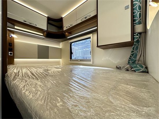 卧室区采用纵置床铺设计,可以同时满足两个成年人在这里休息。床铺还配有高密度的海绵床垫,能够为乘客提供更舒适的睡眠体验。整个卧室区显得极为精致,配置设计也比较齐全,上方设计了多个储物吊柜和半开放式储物格,可以收纳较多的衣物。睡觉时还可以将隐私帘拉上,为乘客提供更好的独立休息空间。