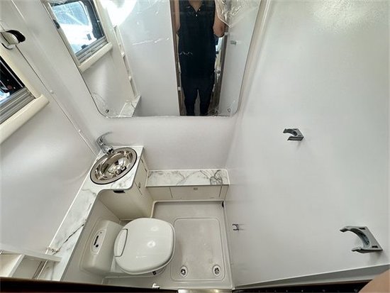 卫生间部分,空间还是比较大的!这是同级别房车里空间感比较好的一款房车了。采用模压、整体式复合防漏水浴室、进口水封电动粉碎式座便器,多功能豪华卫浴系统,洗浴设施完善。水路系统配有美标食品级进口全自动水路,净水箱也从原来的150L升级到了现在的200L,50L灰水箱,美式黑水箱50L,15米食品级外接加水管,重力、压力加水口,水箱加热防冻,外置可插接水龙头出水口,进口手动排污阀等等。