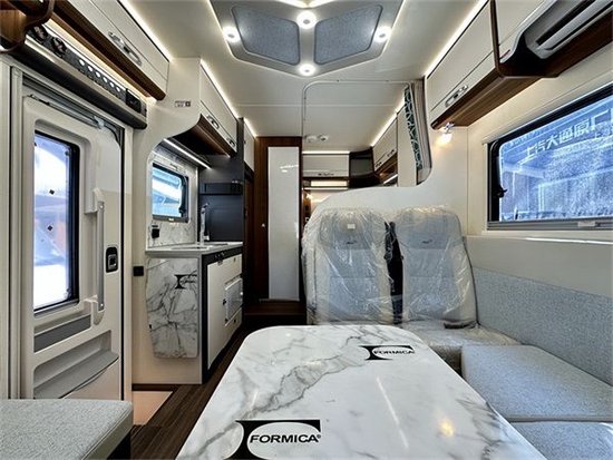 车辆内部的中间位置,是属于会客厅区域,会客区配备有一张L型的卡座沙发,这款沙发采用的是人工体学设计,在舒适性方面具有极高的优势,尤其是在长途旅行的时候,因此也算是一款房车专用沙发,在沙发的中间是一个可自由升降的餐桌,并且餐桌的尺寸设计刚刚好能够与沙发并列组成一张临时的单人床位。