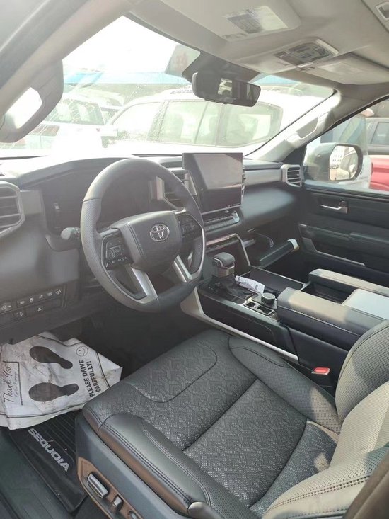 23款丰田红杉四辐式多功能方向盘、并保留了很多物理按键、足以满足驾驶时想要的操控感、车内的科技氛围是通过12.3英寸的全液晶仪表盘和14英寸的中控屏来实现的、中控屏两侧的空调出风口、虽然没有采用时下流行的贯通式设计、但在中控台上对称排列也别有一番风味。
