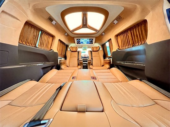 车内顶部为采用的是麂皮绒的软包加上星盾天幕顶灯,除了这些基本的功能性以外,整车在看不到的地方,比如四周全部做了隔音的处理,窗户上都加装的是高级私密窗帘,既可以避免阳光的直接照射,维护车内的一个用车环境,也可以很好的保护我们车主的隐私。