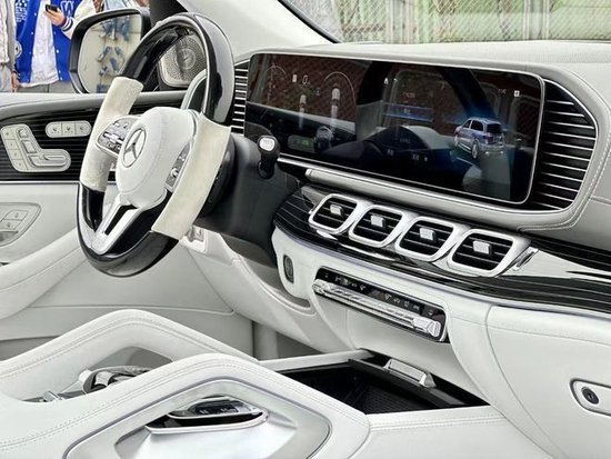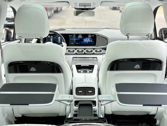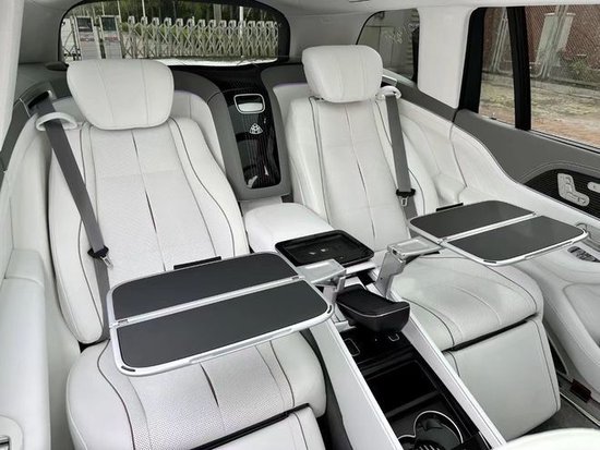 奔驰GLS450改装升级迈巴赫和巴博斯后排座椅改成了两座座椅,安装带平板控制、无线充电器、小桌板的贯穿长条马鞍,构建长途旅行中恬静的车内氛围及充分放松的乘坐体验。
