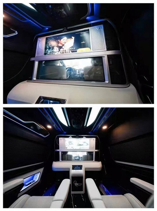 这款隔断墙一眼看上去是不是非常的眼熟?对丰田商务车有很多关注的朋友就会发现,它属于雷克萨斯LM 300四座全隔断的同款隔断墙。从上大下分别由电视机,雾化玻璃,小吧台三部分组成。坐在后排可以日常的看电视,听音乐,娱乐系统展现的很充分。中间的雾化玻璃既可以时时刻刻的观察前面的情况,在需要的时候也可以很好的保护后面的私密性。下方的吧台有可调控的触摸屏以及USB接口,有线充电,还有杯托几部分组成。
