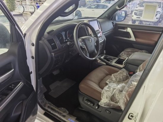 2021款中东版 兰德酷路泽 5700VXR 真皮 KDSS JBL音响 颜色:白/棕 国六B排放标准,手续齐全,随时开票。配置:5.7V8 362匹马力 530扭矩 8档手自一体,全时四驱,天窗,倒影,18寸铝合金轮毂,KDSS底盘,8气囊,皮质座椅,备胎,气泵 前排座椅通风,前排电动调节,多功能皮革+木材方向盘,电动折叠后视镜,浅棕色木材内饰,4区空调,冰箱,UBS接口,眼镜盒,无线充电,电尾门,前后雾灯,手动+自动远光灯,低光大灯LED,远光卤素,大灯清洗,车身条纹,拖钩,门把手镀铬,胎压监测,GPS导航,摇起,无钥匙进入,一键启动,前后雷达,巡航定速,ABS防抱死,BA制动辅助,EBD电子制动,VSC车身稳定,ATRC主动牵引,HAC山地启动辅助控制,MTS多地型选择,动力转向。