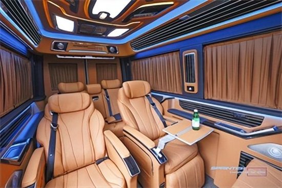 全新的奔驰斯宾特内饰升级版,那不得不提后舱两张豪华航空座椅,依据亚洲人身体形态定制而来,全部采用进口小牛皮包裹,填充物十分柔软。手枕处更选用了更为珍贵的鸵鸟皮皮质,天然的圆点与细腻的皮质给乘客足够的舒适感。靠背上装饰有“寸金寸锦”的云锦装饰,美若云霞!功能上航空座椅配有多向调节、加热通风、舒适腿托、电动电脑桌配套等高等级座舱实用功能。后排沙发床也可以随时电动放平,让车主享受旅途也享受生活。