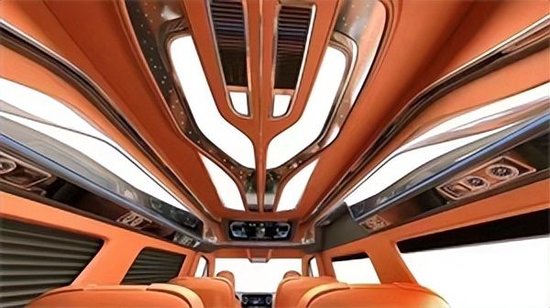 新款斯宾特内饰打造延用之前经典的7+2布局,整车核载7人,另外吧台处设置两个翻折式吧台椅,供临时放脚或者环座使用。环座的时候还可以打开隐藏式滑动秘书桌,临时开会或者打牌娱乐十分方便。