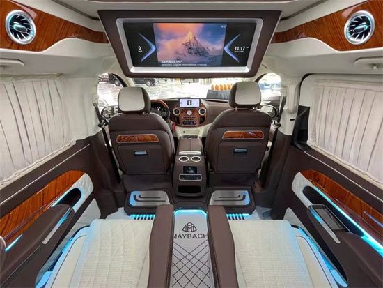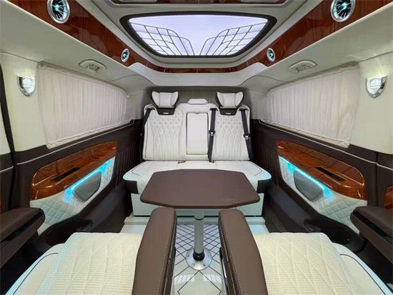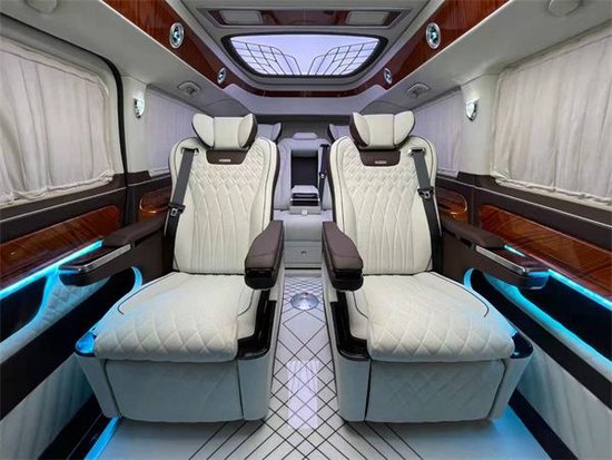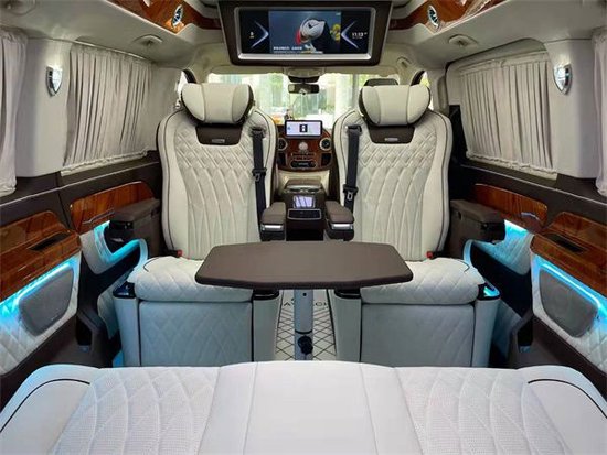 内饰通过改装实现了满足商务接待、洽谈、出游等各种出行需求。全车真皮包覆质感十足。然后它的第二排的座椅也达到了飞机头等舱的标准,手感细腻的进口纯手工真皮包裹,配有精致缜密的缝线, 小范儿细节之处随处可见。不仅看上去更有档次感,而且在您坐上去之后就能感觉到它完美的衬托感!还具有多向电动调节等功能!它不仅可以让乘客更好的休息,也还可以和后排的人一起下棋或者打麻将,因为这个座椅可以旋转到后方,这样就可以轻松的娱乐了,座椅具备了通风和加热、按摩、记忆功能,整车配置强大,说不出一个不好的理由。