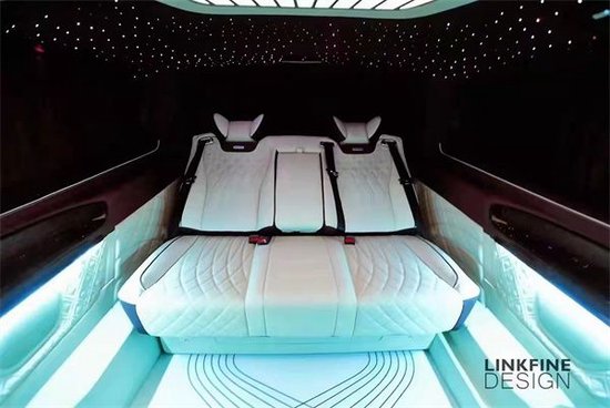 内饰通过改装实现了满足商务接待、洽谈、出游等各种出行需求。后舱必定是绚丽铺陈的舒适化与娱乐功能性体现;一款贴合高端商务出行的豪华商务,基于此项定位。