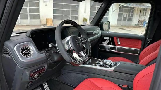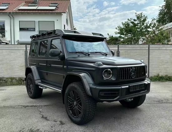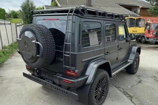 奔驰AMG G 63 4X4加宽了轮眉,新增加了车顶行李架,并还设置了专门的梯子可以方便拿取行李,尾部备胎也看上去更大,整个新车离地间隙变得更高,尾部还新增了一个辅助保险杠。肉眼可见的越野性能全面提升。作为全新一代的升级,新车拥有G 63车型的包围和AMG专属的Green Hell Magno车漆,展现出强大的性能。