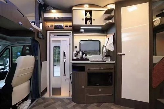 厨房是800瓦的电磁炉,同时带有车外抽拉式燃油灶,多功能的微波炉,进口带盖洗菜盆,全铝的碗碟收纳架,以及进口双开门房车专用冰箱(86.5L冷藏+55L独立冷冻),为生活饮食保驾护航。