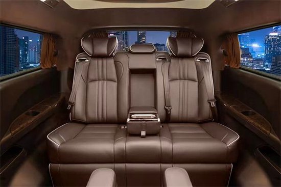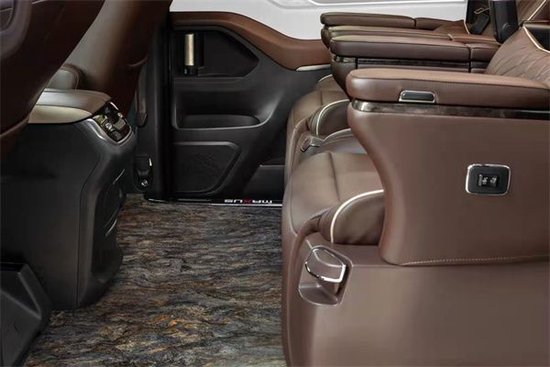 进入车内同样是一个全新的世界,全新的棕色真皮座椅搭配类似大理石效果的地板、暖黄色的顶灯,以及LED网络电视,整个氛围就像在豪华装修的家中,坐在真皮沙发上看电视。