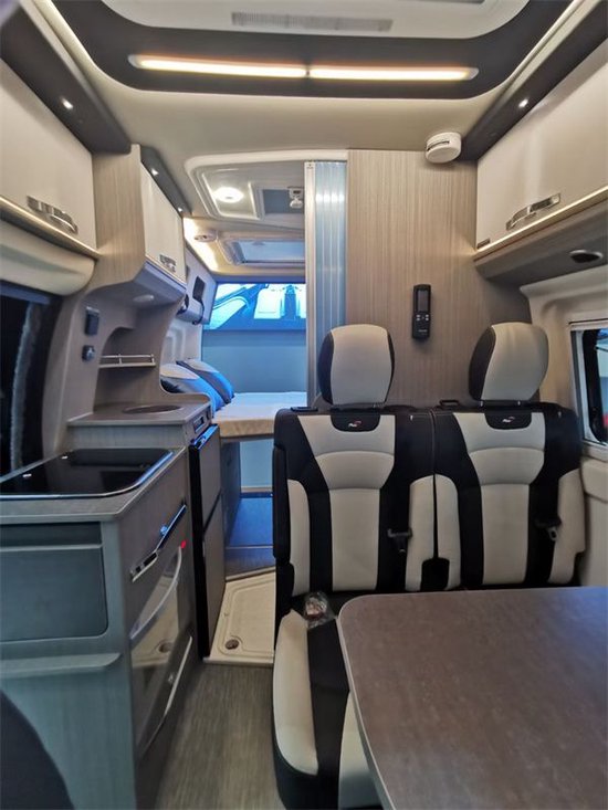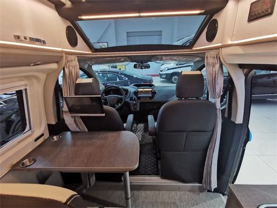 整车驾驶舱的主副座椅均进行了一个包袱,m1类强度双人可调节,而且副驾驶座椅有旋转功能。全车在顶部上面共设计有三个天窗,所以整车的通光性和透风性都是做的非常好。