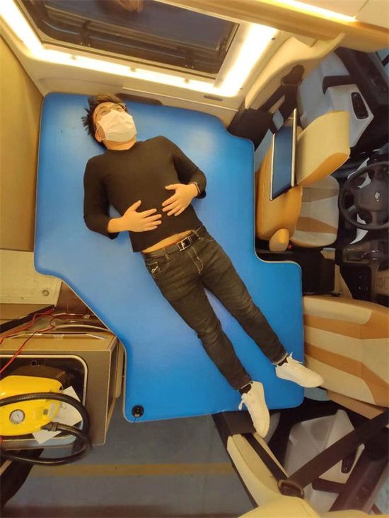 进入到车内,我们可以看到,在主驾驶的座椅后方配备的一套娱乐系统,可以供日常的看电视,听音乐所使用。方形的桌板呢,可以收缩,全车荷载四人,驾驶舱两个座位,生活区两个座位。如果需要五人座的呢,可以做私人定制。