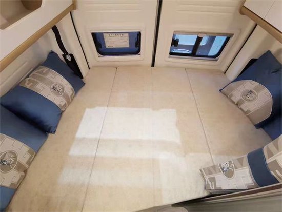 车尾部的是横置床卧室布局设计,尺寸为1850×1200mm,两侧床头ABS吸塑开模件装饰,让身体所触及的地方是舒适和温馨的。满足绝大部分人的睡眠需求,按两人伴侣出行是绝对够用了,后尾门门板同样采用航空级吸塑工艺,保证肤体接触时的舒适度。