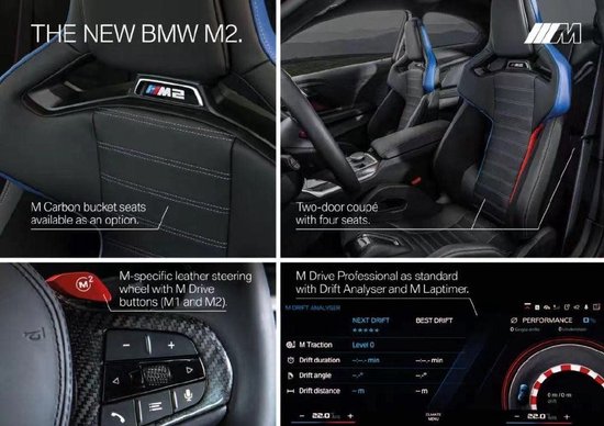 值得一提的是,全新的宝马M2 还带有M牵引力控制系统的M Drive Professional配置,该系统允许驾驶员设置车辆的滑移限制。以此来控制车辆的漂移幅度,同时,M自定义的功能选项,可以允许驾驶员根据自身的喜好来定制车辆系统的各个部分,例如底盘、转向、制动、牵引力控制。并标配了自适应M悬架以及主动式M差速器。