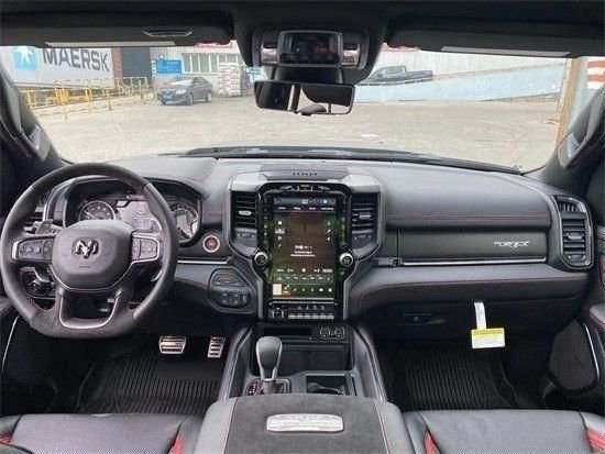 道奇公羊霸王龙在内饰部分进一步强化了其高性能版本的形象,中控台和座椅随处可见的TRX标识便是最好的例证。同时,作为道奇家族的旗舰车型,新车还配备了12英寸竖置中控屏幕,除了支持蓝牙、导航和车载Wi-Fi等常见功能,还支持Apple CarPlay和Android Auto手机映射。