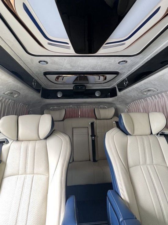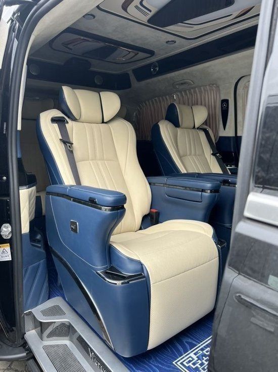 奔驰威霆改装无隔断七座商务车第二排座椅采用两个62S首长级座椅,带加热,按摩,通风,一键式电动调节记忆等功能。奔驰威霆改装七座无隔断座椅符合人体工程学设计,同时带有电动椅背调节,电动头枕,电动前后调节,180°旋转,一键式伸缩腿托功能,带来头等舱级舒适体验,,私家客厅级后舱体验,180°旋转后可以与第三排电动沙发床进行无缝拼接,满足两个成年人一个小孩的正常休息,带来卧室级舒适享受。
