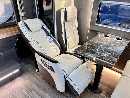 会客区两张航空座椅,按摩加热通通实现,更好放松全身心,满足商务会客的需求。厨房区域采用一体化设计,让洗、切、蒸、烤一气呵成。台面上洗菜池,水龙头一应俱全。下方是蒸烤一体机和多个储物空间,收纳餐具完全没问题。侧面延长桌板,拓展做饭空间。还有142升冰箱,超大空间,容纳更多喜爱的食材。