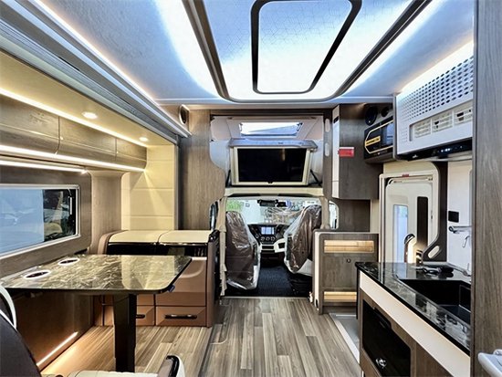内部简约大气雍容华贵,东方风雅的韵味油然而生。多处中式特有的诗情画意。内部布局为前部驾驶室,额头床,中部会客区,厨房区域,尾部卫生间,睡卧休息区。额头床可容纳两人,顶部配有天窗,旅途中晚上可以欣赏满天星光,床头小夜灯不仅方便照明,也营造浪漫的氛围。