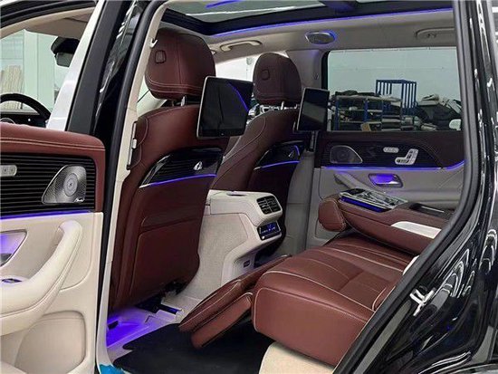 23款奔驰GLS450改装后排座椅改成了两座座椅,安装带平板控制、无线充电器、小桌板的贯穿长条马鞍,构建长途旅行中恬静的车内氛围及充分放松的乘坐体验。