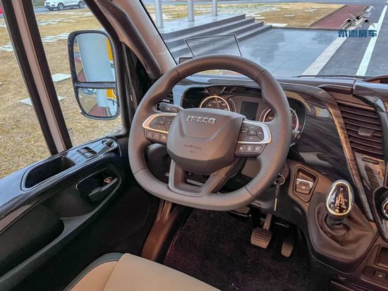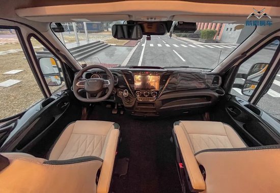 进口依维柯New Daily底盘的驾驶室,体现的是精致和商务气息,尤其是戴德E途系列房车多以商务大气的稳重形象展示。新车搭载一款3.0T柴油涡轮增压发动机,匹配8AT变速箱,峰值扭矩430N·m,最大功率132kW。安全辅助系统方面,配备ABS+ESP9.2车身电子稳定系统,多功能方向盘、10.5寸中控屏,六轮胎压监测及倒车雷达等,驾驶舱主副驾驶座椅,采用NAPPA劳斯莱斯同款真皮包裹,底盘还配备有空气减震系统,过滤了道路颠簸的同时,保证了长途行车时的舒适性。可以说它的丰富程度在一些轿车上都少见,依维柯更多的是想让这款车底盘车型轿车化,以适应改装房车之后对应驾驶舒适性的考量。