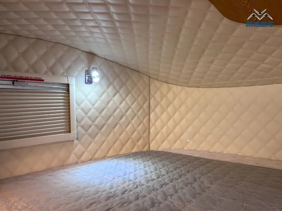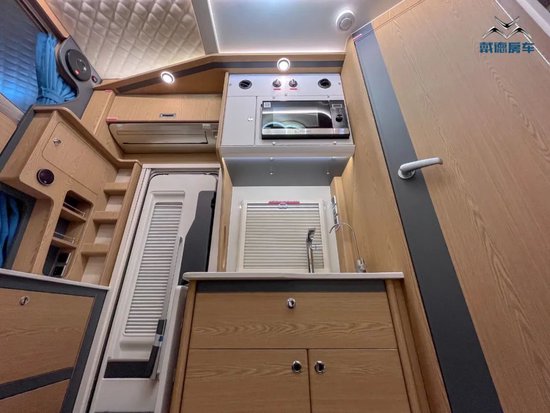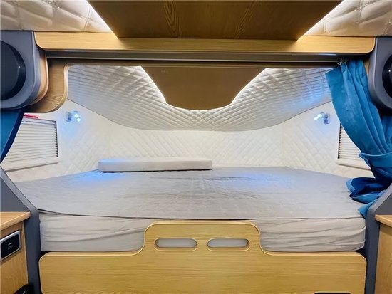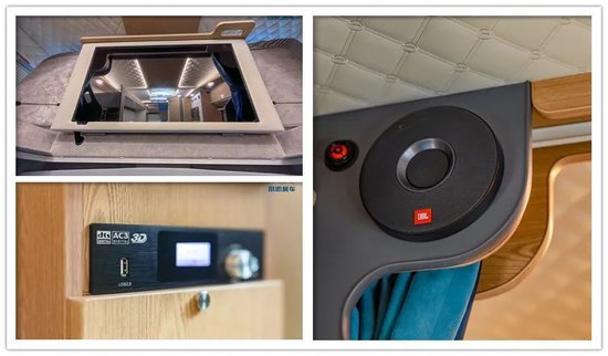 驾驶上方额头床床板翻起是40寸智能电视,让你旅途也照样能追剧。车内的影音系统依然强大,配备5.1声道的JBL功放组合套装,Infinity超薄重低音单元、富声多媒体功放机、JBL扬声器。让你在旅途中也能畅想影音娱乐。