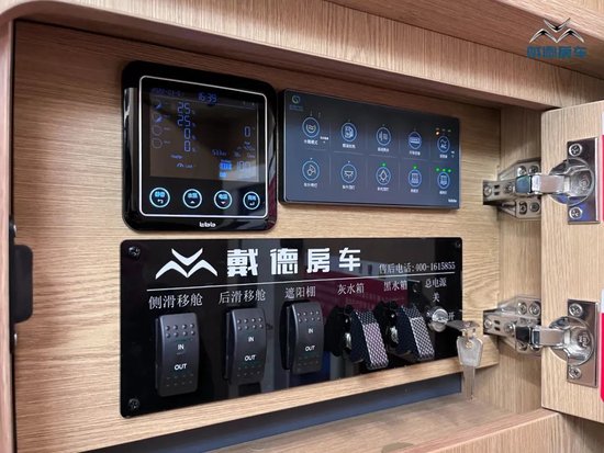 新变化:车内的主操控面板由这款平板电脑替代,平板内的UI界面由戴德房车联合拓宝电器定制,按钮非常丰富,融合了车内常见的大部分功能,尤其是在车内电能上的显示非常全面,可以实时观察原车底盘充电效率和光伏板的充电效率,当然还能通过APP后台操作这些功能。