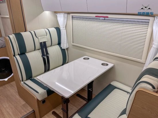 侧拓展区域对应车内的4人会客区,卡座沙发采用 NAPPA真皮座椅,可以满足四人同时落座的脚部活动空间。餐桌为机械折叠形式,餐桌也带有向外延展功能。