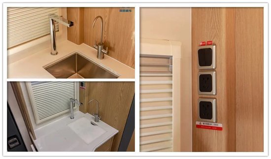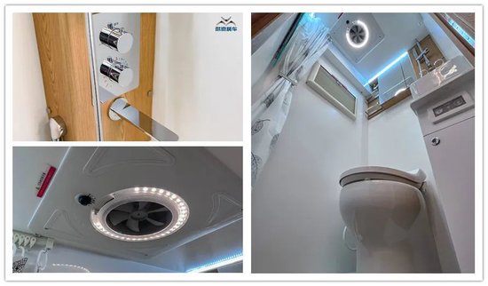 卫生间部分在全新E途pro max上依然很熟悉,酒店式卫生间,匹配赛特福德进口全尺寸游艇陶瓷电动粉碎马桶+松下智能马桶盖、卫生间陶瓷面盆+带温控显示的水龙头+独立淋浴花洒,进口MAXFAN换气扇、欧式储物镜柜、LED高清化妆镜,而这一切设备也是当前C型房车中算的上最豪华的配置了。整款车小米净水器+外置注水口(带自吸功能)水电配置是:保温双净水箱300L+抗菌水管、保温灰水箱80L、保温黑水箱90L,配电动排水开关和环保抗菌水管,逆变充电机是48V4000VA 30A、48V磷酸铁锂电池21.5KW·H、1200W太阳能电池板(120W*10块),真正的水电无忧、四季畅玩的房车,不需要找露营地补给的一款高品质房车。