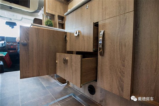 在讲厨房区域的一个设计,就是戴德通系是不配备抽油烟机的。戴德的设计师认为,目前的房车抽油烟机分为顶置蘑菇头,这种抽油烟机,是在顶上打个洞,时间长了的话,开胶会造成车辆漏水,侧排的抽油烟机在车辆行驶的过程中会有异响,而且容易造成倒灌风。戴德如果在车内做重油烟的东西,用的是一个气压压强的原理,在车辆的底部是有一个双向的换气扇,做饭的同时把换气扇打开,往里面吹风,然后把窗户打开,这样利用气压压强的原理,就可以把油烟抽出到车外去。