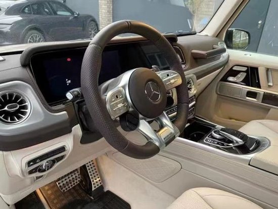 23款奔驰G (配置|询价)63中控台较为引人注意的就是空调口的设计,设计师称设计灵感来源于发动机的涡扇,带来了动感的造型以及富含力量感的气势。全新造型的平底式AMG运动方向盘战斗力十足,其两侧还配以打孔皮质包裹手感绝佳。