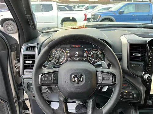 全新23款道奇公羊霸王龙TRX在内饰部分进一步强化了其高性能版本的形象,中控台和座椅随处可见的TRX标识便是最好的例证。同时,作为道奇家族的旗舰车型,新车还配备了12英寸竖置中控屏幕,除了支持蓝牙、导航和车载Wi-Fi等常见功能,还支持Apple CarPlay和Android Auto手机映射。