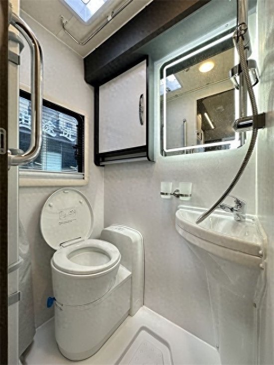 厨房区位于车厢中部。配备志高电磁炉及不锈钢洗手池等;上方和下方均设计有多组储物柜,储物空间丰富;周围一组220V电源插座可为手机等小型电器充电。配有12L饮用水装置,直饮安全卫生又便捷。橱柜右侧设置调料架,下方有储物空间。标配900W电磁炉、微波炉,旅居途中随时享受美味。标配85L房车专用冰箱,可选152L超大容量房车专用冰箱,保障食材新鲜。