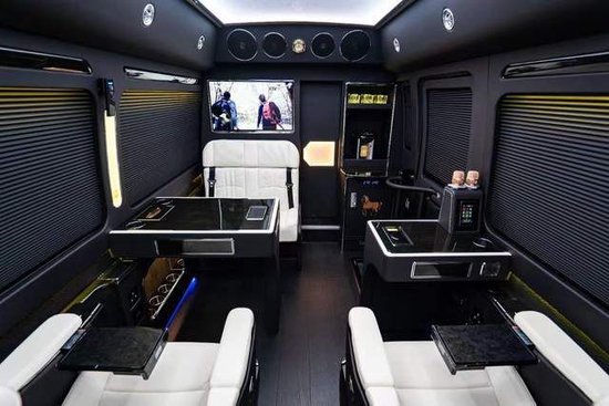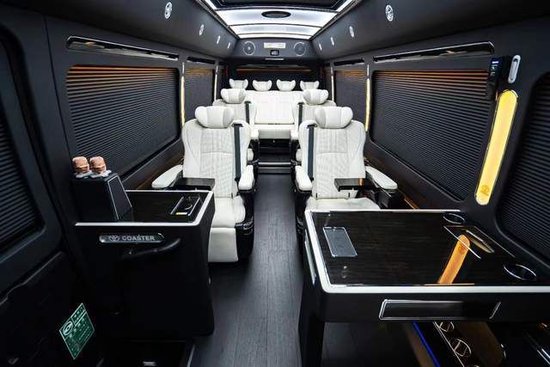 丰田考斯特移动办公室,会议室等功能,丰田考斯特车内搭载了丰富的办公设备和多媒体演示设备,例如车载电脑,车载打印机,卫星通讯,蓝牙设备,移动WiFi等等,方便在出行的过程中遇到紧急事情可以在车内或者进行远程会议!