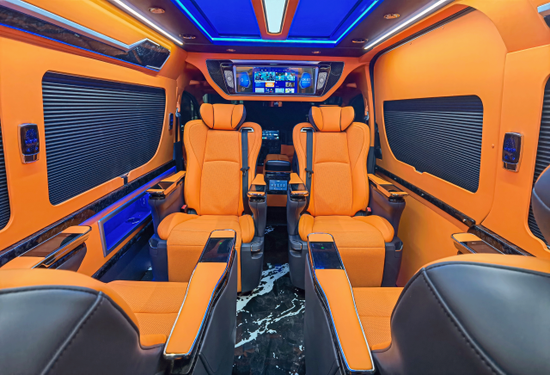 原装进口丰田海狮系列的全新创造舒适的商旅享受。宽畅滑动侧门,与领先商务相谐,乘客出入更自如快捷,富绰空间,长途旅行不再局促而劳累;后排座椅可向上和左右两侧折叠,更大的行李空间。东方众威原创改装前后舱隔断,加装升降电视系统,独有的彩色倒车影像系统,可以全方位提供大角度的清晰后视画面,从主动性上进一步提高了车辆的安全性能。