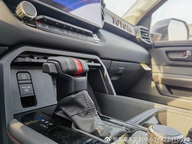 23款丰田坦途座椅提供有皮质包裹,整体的造型也非常宽大,在中央扶手区域的设计上也采用了非常方正的造型设计,并且可以看到前排的储物空间设计还是非常丰富的。