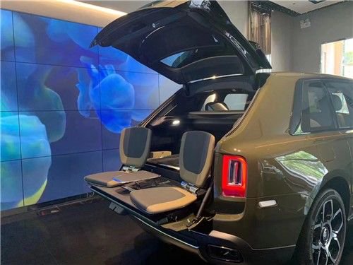 劳斯莱斯库里南BB限量版香槟酒具的酒柜和冷藏箱。专为幻影长轴距版车型打造的静享座椅座椅间固定的中央扶手台设有存放定制香槟酒具的酒柜和冷藏箱,电子控制的座椅角度,并带有按摩功能及座椅扶手加热功能。腿部支撑可电动伸展90°为后排乘客带来极致舒适的体验。劳斯莱斯库里南后排座椅底座设计高于行李厢地板,即使两个座椅均下折,行李厢中的物品也会被完好固定而不会向前滑落,