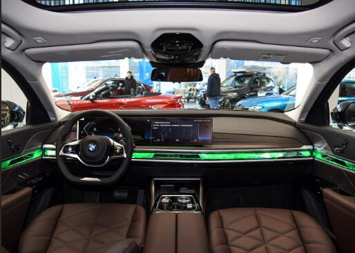 宝马735Li内饰方面,以简约的设计风格为主,整体设计前卫,中控采用了12.3英寸仪表和14.9英寸中控屏组成的曲面双联屏,车机系统为iDrive 8车机系统,科技感可见一斑。再加上两幅式的方向盘和水晶电子档杆,质感尽显。
