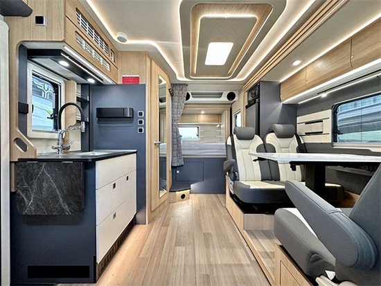 生活区采用了暖色调的内饰风格,从前到后的区域依次为驾驶室+额头床、会客区、厨房区、卫浴间以及尾置睡卧区。整车铺设了仿实木地板革,简洁明朗的北欧现代设计风格,融入多处细节造型设计,巧妙的的灯光照明设计加镀铬金属材质的映射,烘托轻奢家居氛围。车厢内高可达2015mm,用户的适用范围更加广泛。
