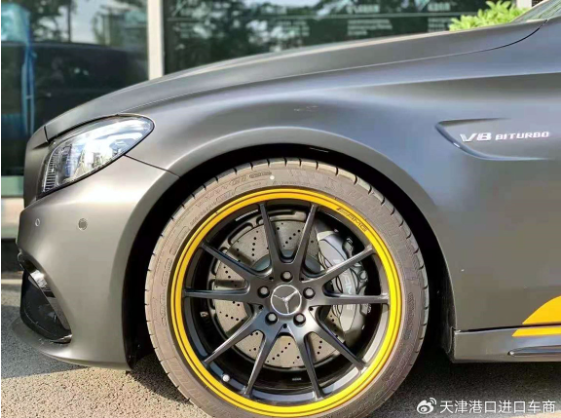 前轮拱翼子板处的V8 BITURBO已经明示了这台车的实力,这不是一台普通的奔驰C级。十幅黑化锻造轮圈边缘做了黄亮喷绘涂装,再搭配红色AMG大卡钳、打孔刹车盘,视觉冲击强烈,性能范儿十足。前轮标配19寸轮毂,后轮20寸,轮胎规格为前255/35 R19,后285/30 R20。