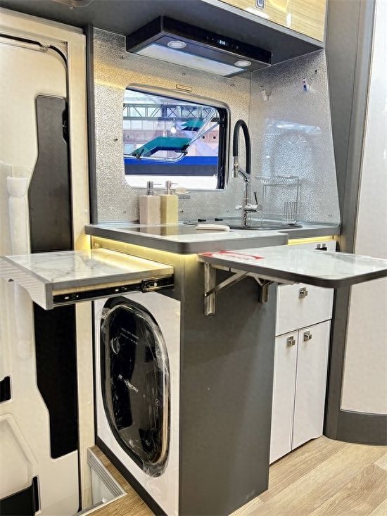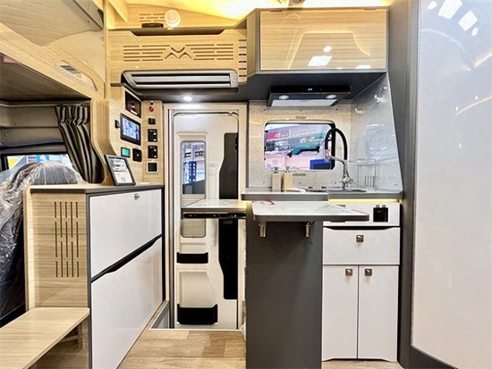 会客区对侧是厨房区,设有整体式橱柜,配备了独立水龙头、赛特福德洗菜池、嵌入式电磁炉、电源插座等,可满足日常烹饪需求;橱柜左侧还配备折叠板,增加操作台使用面积。储物方面设有组合式橱柜+厨房吊柜,可分区存放厨房物品。厨房区左侧设有水电控制系统和灯光、暖风控制开关,可实时调控车内水电、照明等设施。