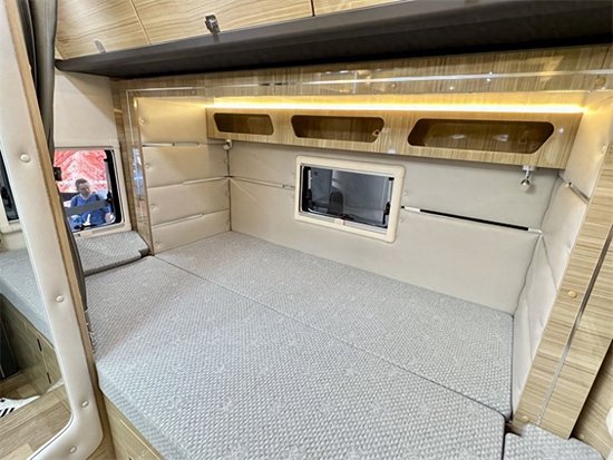 尾部睡卧区是一张横置床设计,拓展机构打开后,可睡上两个成年人。床边采用软包设计,看起来更加舒适豪华。床铺周围有窗户设计,带来采光通风效果。两侧床头都有USB充电接口和220V电源插座,晚上充电很方便。床铺上方是储物空间,用于放置衣物。