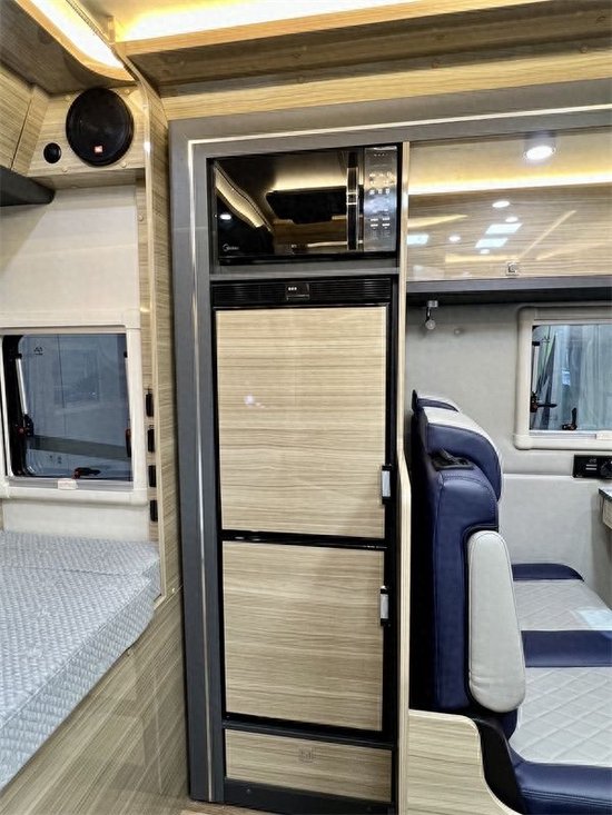 生活区由休息区、会客区、厨房区、卫浴区共同组成,涵盖日常生活使用功能;进入生活区不难发现,车内空间在拓展机构打开后,整体表现通透明亮,非常宽敞,宛若精装修的一室户;车内家具选用E0级环保板材打造,底部铺设木质地板革,内饰风格整体看上去偏向成熟稳重,还带着一些淡雅、自然的韵味;客厅过道的宽度在拓展舱展开后可达到110cm,即便不拓展也有着62cm,通过性能良好,日常进出不会感到狭隘、拥挤。