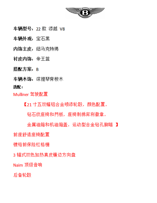 22款宾利添越纯手工打造的奢华感受、经典优异的设计理念、激情澎湃的动力和性能展现,还有舒适且令人兴奋的驾乘感。正是这些无可比拟的特性组合,才成就了宾利品牌的独一无二。革命性科技藉由宾利最为先进、直观的信息娱乐系统和驾驶辅助系统,将驾驶者与乘车贵宾有机地联系在一起,令驾乘体验愈加和谐有度。